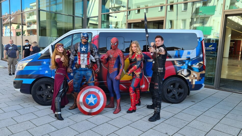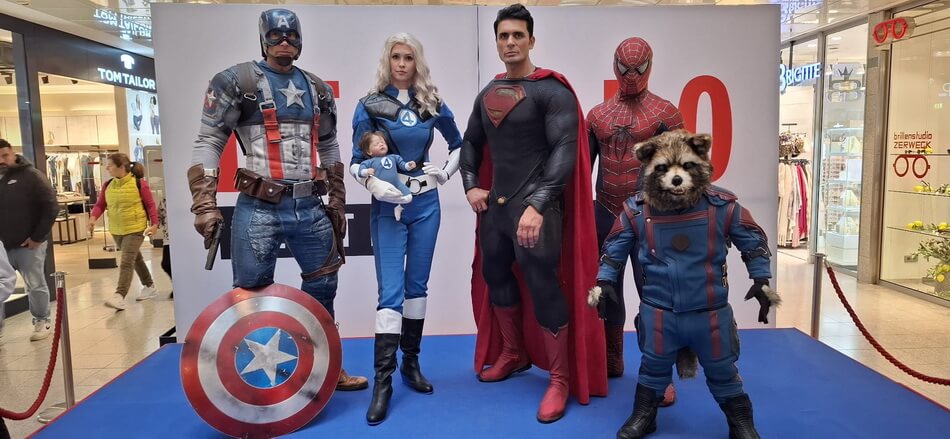 Die Superhelden eignen sich nachweislich, um die Besucherzahlen zu erhöhen, für einen erfolgreichen und stark frequentierten Messestand, um ein neues Produkt werbewirksam auf den Markt zu bringen oder um mediale Aufmerksamkeit zu erlangen. Die weltbekannten Charaktere schaffen Erinnerungen, die ein Leben lang im Gedächtnis bleiben werden! In ihren hochwertigen Kostümen sind sie ein beliebtes Fotomotiv, das allen Gästen ein strahlendes Lächeln zaubert. Vor individuell gefertigten Fotoleinwänden oder einzigartigen Kulissen entstehen zudem besondere Marketingmotive, die in den sozialen Medien (TikTok, Instagram, WhatsApp, Facebook) schnell viral gehen.