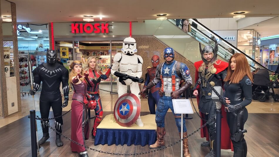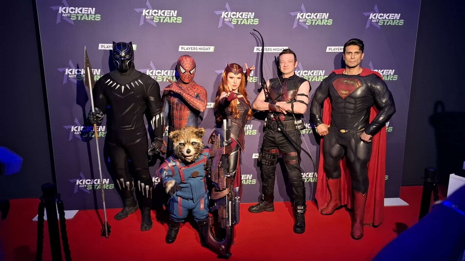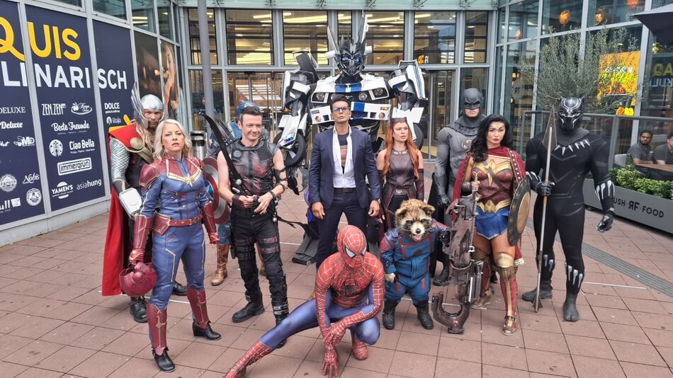 Ironman, Hulk, Rocket, Spiderman, Captain America, Black Panther, Thor, Hawk Eye, Dr. Strange, Captain Marvel, Antman, Deadpool, Wolverine, Black Widow – Wir haben Sie alle!! Diese Helden eignen sich für jeden Messeauftritt, Kongress, roten Teppich, Betriebsfeier, Ausstellung, Produkteinführung, Werbespot oder als Überraschungseffekt.